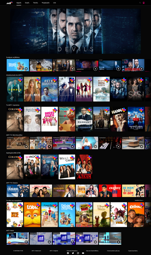 O Όμιλος Antenna, ο κορυφαίος πολυεθνικός οργανισμός media, περιεχομένου, ενημέρωσης και ψυχαγωγίας, αξιοποιώντας την εμπειρία και τεχνογνωσία που διαθέτει λόγω της μακρόχρονης διεθνούς δραστηριότητάς του, επεκτείνει την παρουσία του στο χώρο των ΟΤΤ (Over The Top) υπηρεσιών. Την Τρίτη 12 Απριλίου 2022 φέρνει, σε Ελλάδα και Κύπρο, τη νέα streaming πλατφόρμα ANT1+ μέσα από τον ιστότοπο antennaplus.gr.