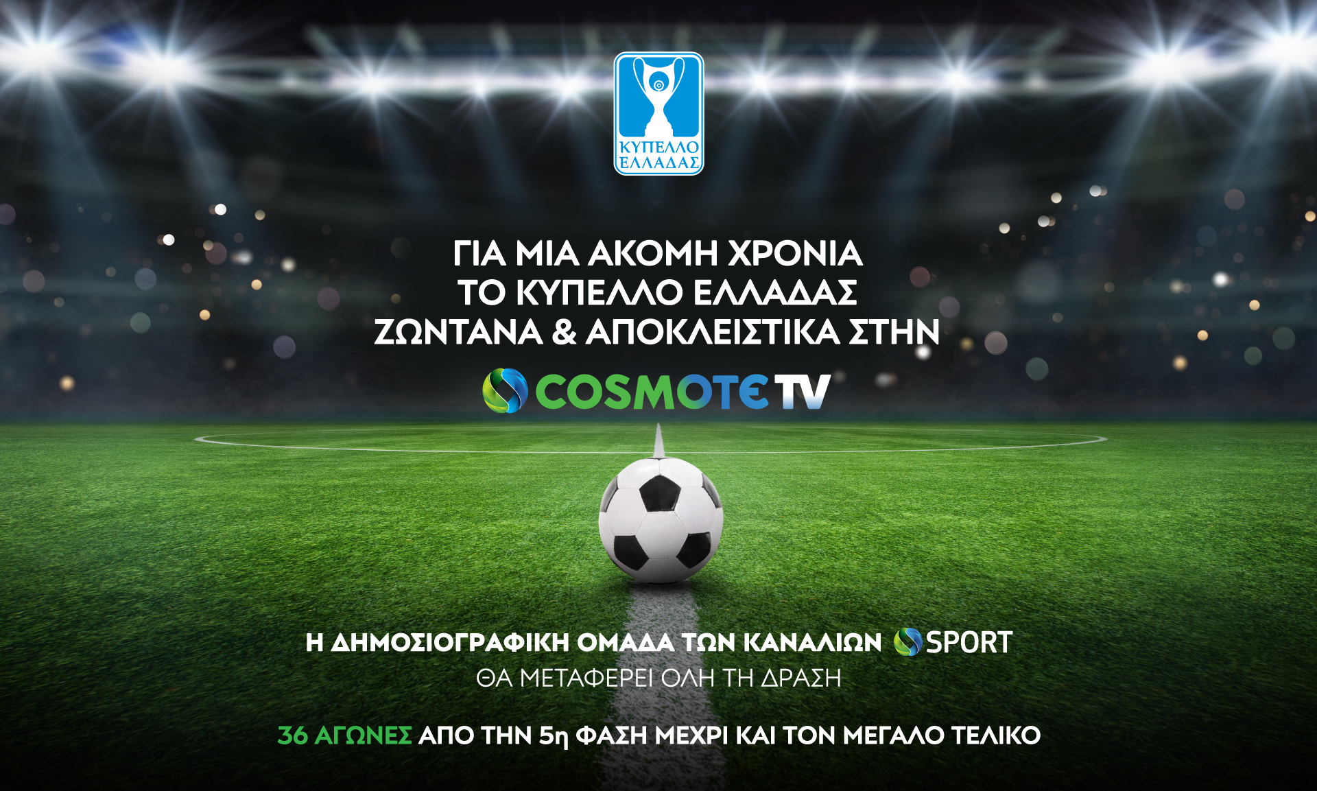 Για 13η χρονιά, το Κύπελλο Ελλάδας ποδοσφαίρου, ο θεσμός των μεγάλων εκπλήξεων, έρχεται ζωντανά και αποκλειστικά στην COSMOTE TV. Η δημοσιογραφική ομάδα των καναλιών COSMOTE SPORT θα μεταφέρει τη δράση 36 αγώνων, από την 5η φάση μέχρι και τον μεγάλο τελικό, με πλούσια ρεπορτάζ και ειδικές εκπομπές.