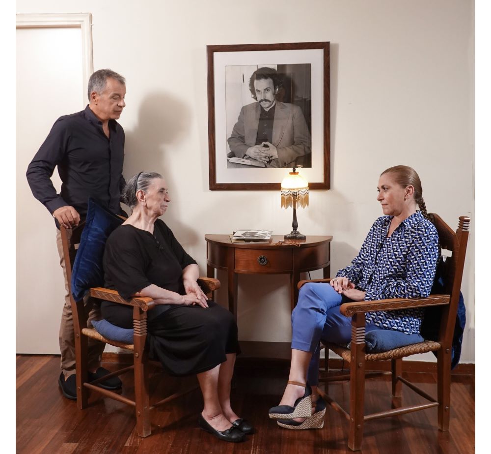 Ο Σταύρος Θεοδωράκης μιλάει μεταξύ άλλων με την γυναίκα του, Ουρανία, την κόρη του, Ρηνιώ και τα αδέλφια του, Γιάννη και Αντώνη (γνωστό ως Ψαραντώνη).